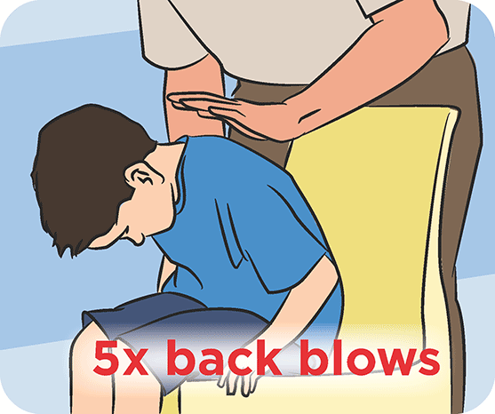 Bend the child forward. Use the heel of your hand to give a firm back blow between the shoulder blades. Give up to five back blows. Check between each blow to see if the blockage has cleared. If it hasn’t cleared, try chest thrusts.
