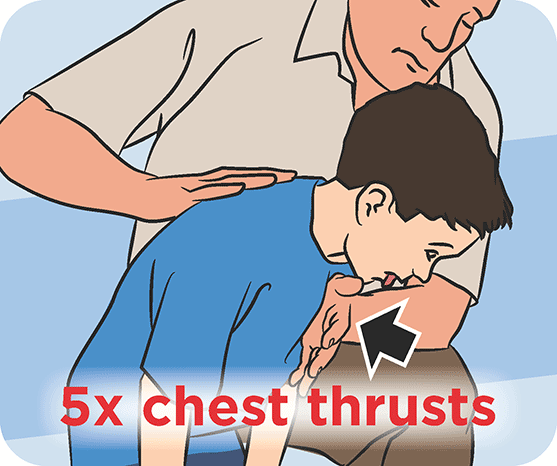 Put one hand in the middle of the child’s back and the other hand in the centre of the chest. Use the heel of the hand on the chest to do five chest thrusts – like CPR compressions but slower and sharper. Check to see if the blockage has cleared between each thrust.