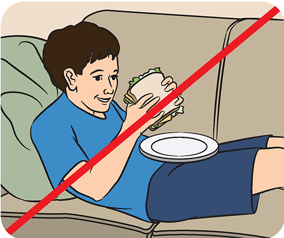 Get your child to sit while eating. Encourage your child to chew and swallow properly.