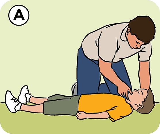 Check the child’s mouth for airway blockages like the tongue, food, vomit or blood. If there’s a blockage, roll the child onto their side, keeping their top leg bent. This is the recovery position. Clear blockages with your fingers, then check for breathing.