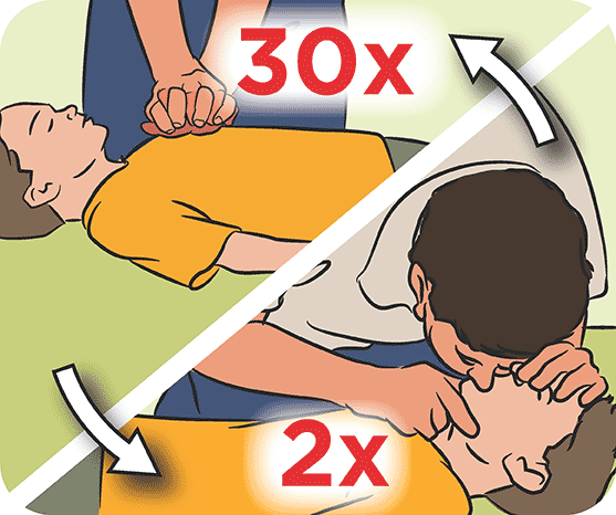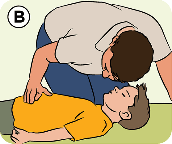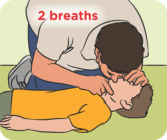After 30 compressions, tilt the child’s head back to open their airway. Take a deep breath, seal your mouth over the child’s mouth and pinch their nose. Give one steady blow and watch for their chest to rise. Take another breath with your head turned towards the child’s chest. Watch, listen or feel for air leaving the chest. Repeat.