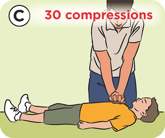 Put the heels of your hands in the centre of the child’s chest. Do 30 compressions at a rate of 2 compressions per second. Each compression should push the chest down by about one third.