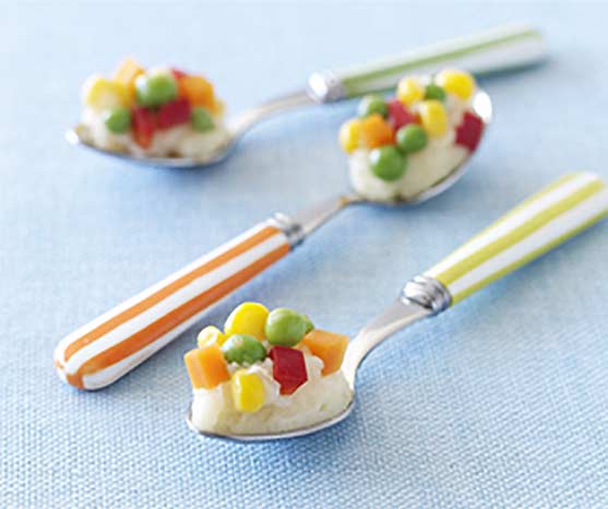 Make mealtimes fun. Pretend that mashed potato is ‘potato glue’ that other vegetables love sticking to. Let kids dip spoons of mash into piles of peas, corn, diced carrot and other vegies.