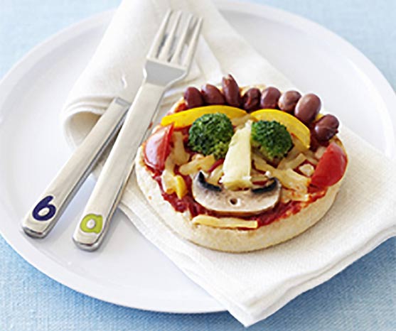Turn a simple pita bread pizza into a fun Mr Vegie face by arranging pizza toppings to make eyes, nose, mouth and ears.