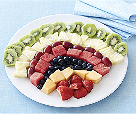 Make a fruit rainbow using strawberries, pineapple, watermelon, kiwifruit, red grapes, oranges or rockmelon, and blueberries. Encourage kids to try each fruit on the rainbow.