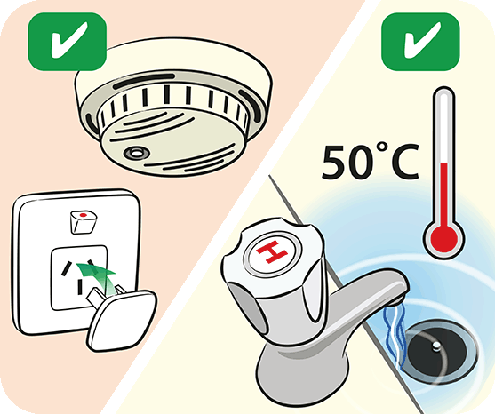 Install smoke detectors, safety switches and power point covers. Ensure that water coming out of your bathroom taps is no hotter than 50ºC.