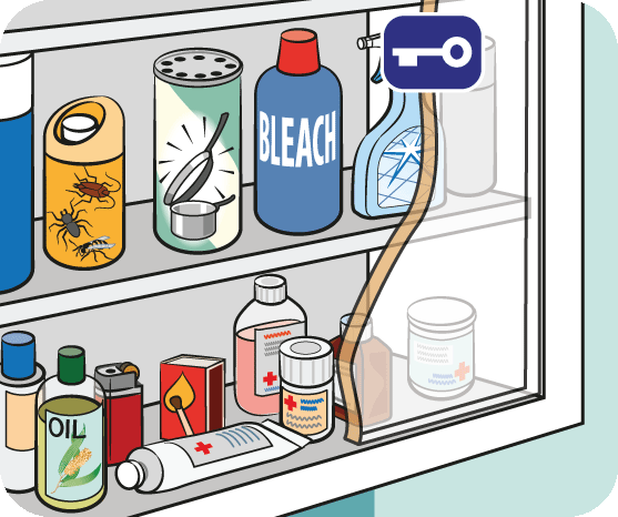 Securely store household poisons in a cupboard that’s at least 1.5 m high and has child-resistant locks.
