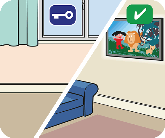 Lock windows. Move chairs and other things away from windows. Attach TVs and other heavy furniture to walls or the floor so they can’t fall on your child.