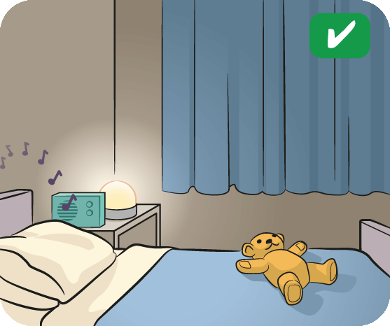 A quiet, dimly lit bedroom is good for sleep. Too much light can make it harder for your child to fall asleep. Your child can use a warm-coloured night-light.