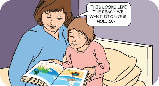 Choose a book with pictures of a place your child can imagine. Avoid scary pictures. Talk about the pictures. Ask your child if they can see a picture in their mind.