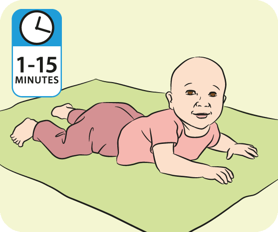 Start tummy time soon after birth. In the first few weeks, try tummy time for 1-2 minutes, 2-3 times a day. Your baby can build up to 10-15 minutes, several times a day.