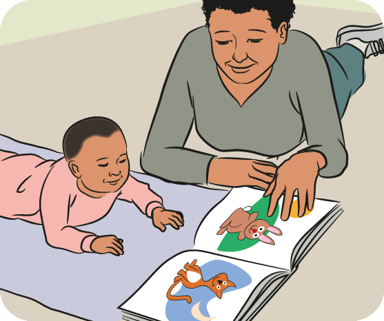 Get down on the floor next to your baby. Turn pages in picture books or magazines. This develops your baby’s eye strength and keeps them interested.