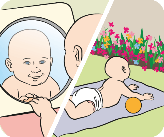 Put a non-breakable mirror next to your baby so they can see their reflection. Try tummy time in different places, like outdoors on a blanket.